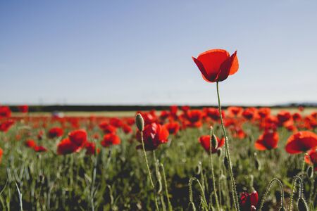 Poppy fields blooming. A poppy is a flowering plant in the subfamily Papaveroideae of the family Papaveraceae. Papaver is a genus of frost-tolerant annuals, biennials, and perennials. Sunny outdoor.