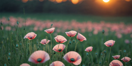 AI Generated. soft pink petals unfurl on lush green field at dusk poppies field landscape