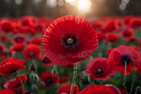 Poppy field in full bloom against sunlight. Field of red poppys against the sunset sky. Remembrance Day, Memorial Day, Anzac Day in New Zealand, Australia, Canada and Great Britain. Armistice concept. Generative AI