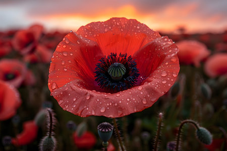 Dew-kissed red poppy flower in a vast field at sunrise, the delicate petals and central details. the vibrant colors and serene setting emphasize nature's beauty, perfect for nature prints and floral photography enthusiasts. Generative AI