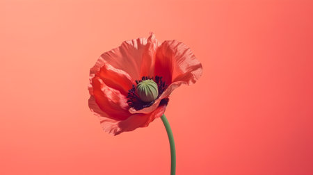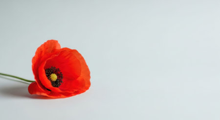 A bright red poppy flower rests on a clear background in a studio. The flower stands out with its vibrant color.