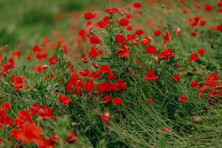 field with green grass and red poppies against the sunset sky. Beautiful field red poppies with selective focus. Red poppies in soft light. Opium poppy. Glade of red poppies. Soft focus blur