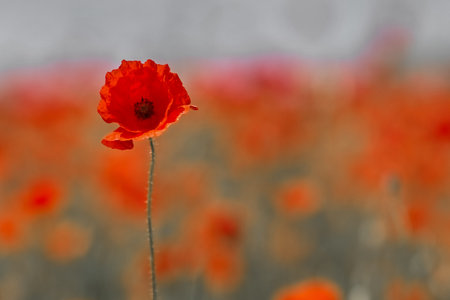 Remembrance day poppy. Red poppies in a poppies field with desaturated background
