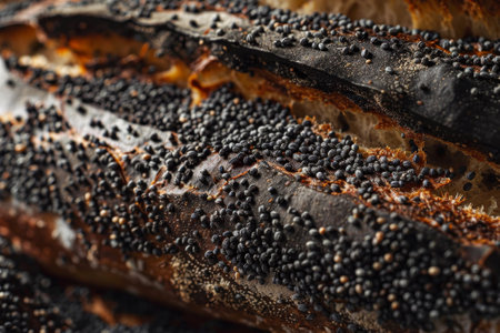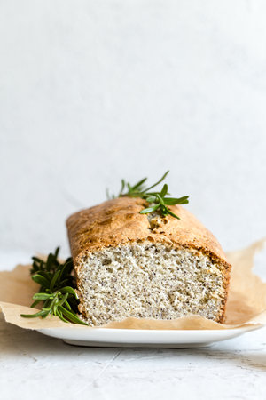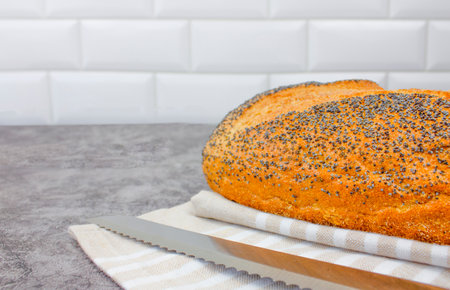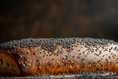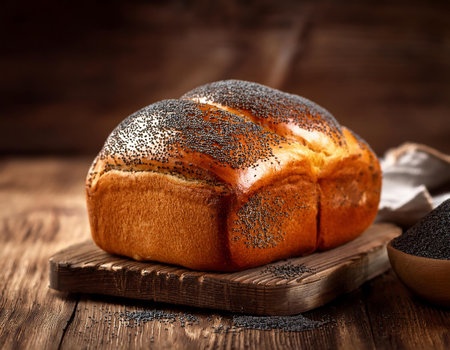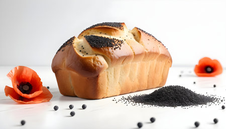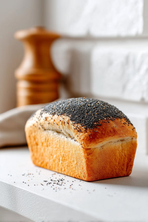 Poppy seed-covered loaf highlights minimalist design style with clean lines. Loaf sits on white surface with soft lighting, showcasing fresh baking concept. Concept of bakeries, cafes, restaurants.