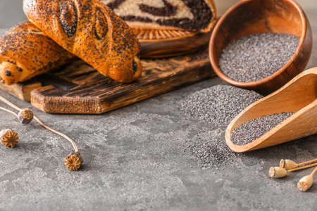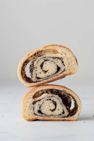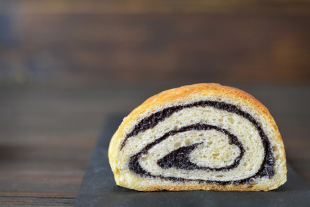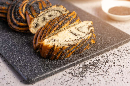 Still life of babka cake or brioche with poppy seeds on the old wood plate, delicious swirl bread