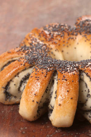 Homemade poppy seed braided bread, selective focus . Wreath. National pastries. Babka
