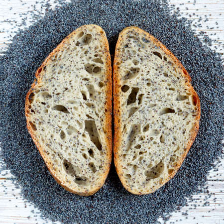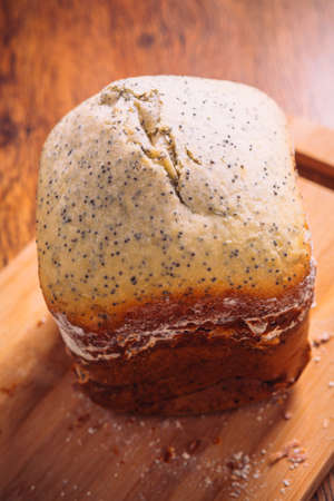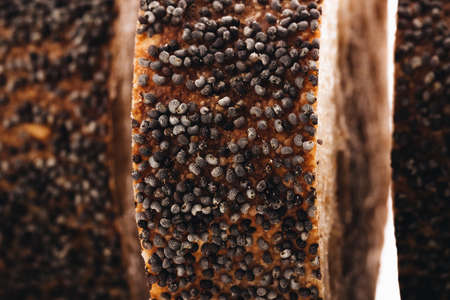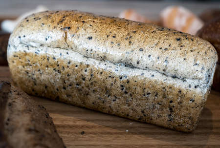 Whole wheat bread. Fresh loaf of rustic traditional bread with wheat poppy seeds in pattern of macro photography. Rye bakery with crusty loaves and crumbs. Homemade baking