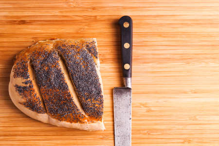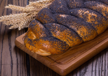 Traditional Jewish holiday challah with poppy seeds homemade on table on wooden board. Horizontal photo.