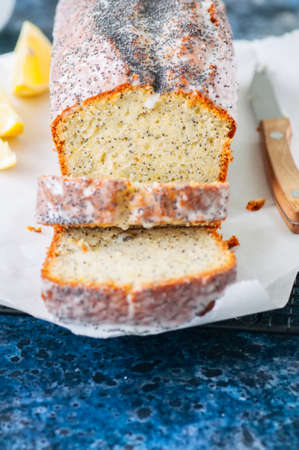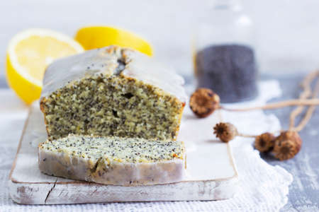 Lemon cake with poppy seeds, covered with glaze on a light background. Selective focus.