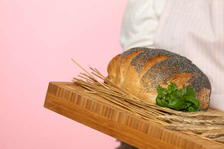 A young girl with a beautiful European beauty holds in her hands on a wooden board a freshly baked loaf of poppy seed bread, decorated with green herbs and ears of grain. The whole composition is set against a uniform light pink background.