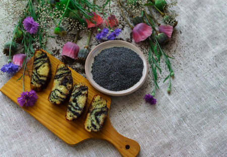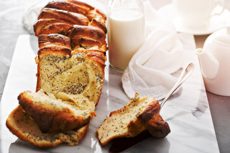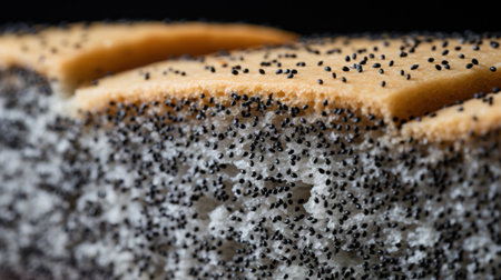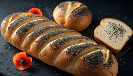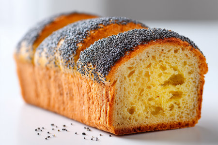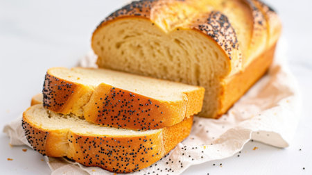 A beautifully arranged image of freshly baked sliced bread with poppy seed topping, ideal for showcasing bakery products and breakfast themes.
