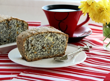 Cake with poppy seeds and lemon zest, sprinkled with powdered sugar