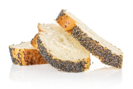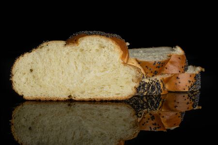 Group of three slices of fresh twisted poppy seed bun isolated on black glass