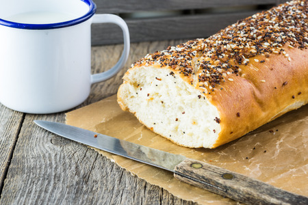 Wheat bread sprinkled with poppy seeds, caraway seeds, and sesame seeds on a patterned tablecloth embroidered folk
