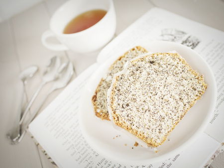Two slices of homemade poppy cake on plate standing on open book with cup of tea and spoons on background