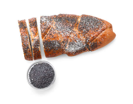 Cut poppy seed roll and spikelets on white wooden table, top view with space for text. Tasty cake