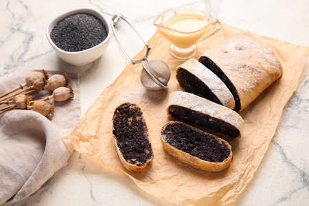 Pieces of homemade, fresh strudel with poppy seeds on paper top view