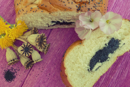 bun with poppy seeds and a piece of bun with yellow and pink flowers and dry poppy seed pods on a purple background. poppy festival