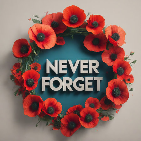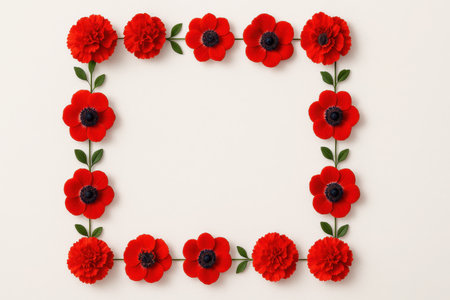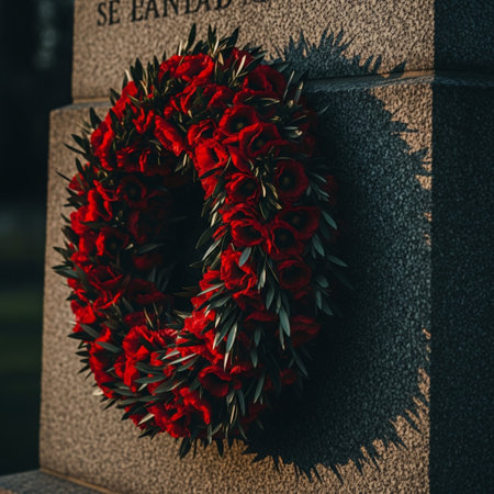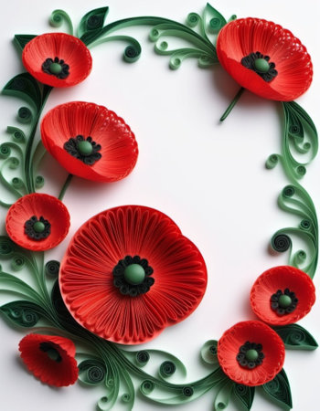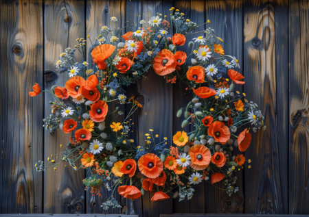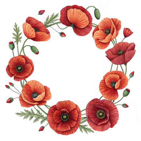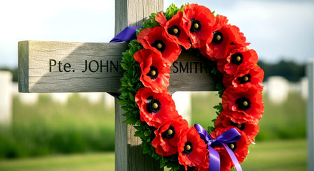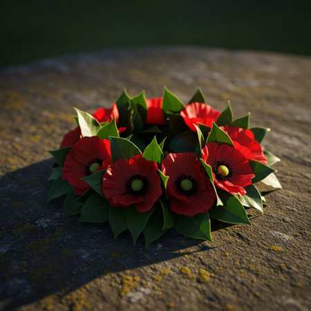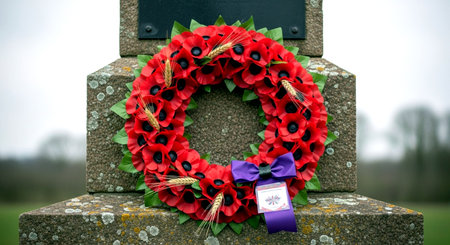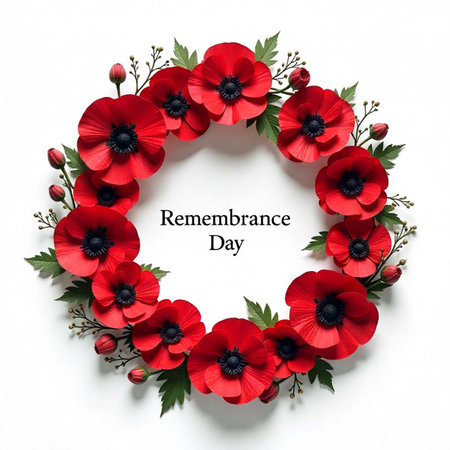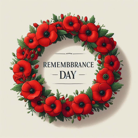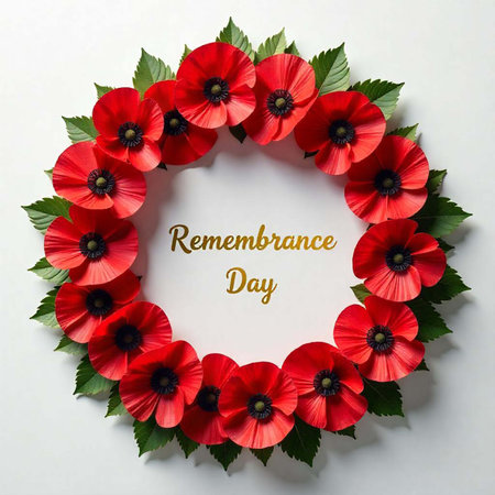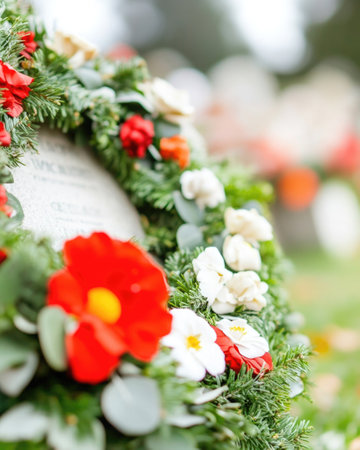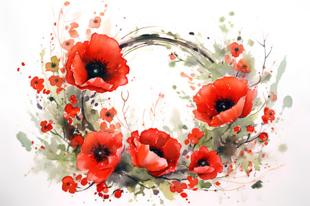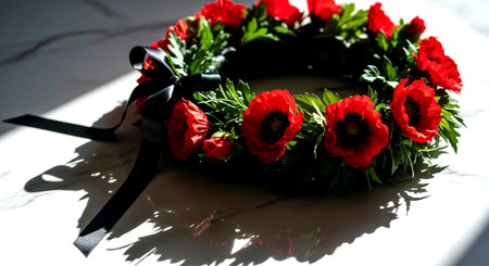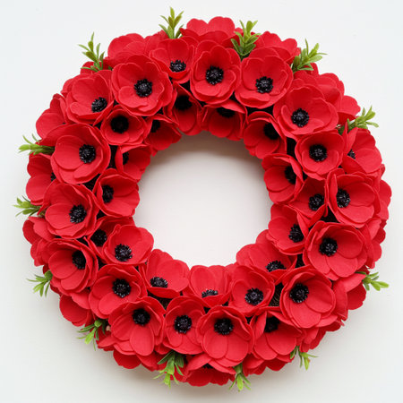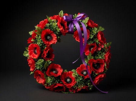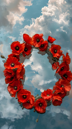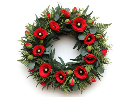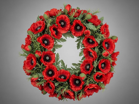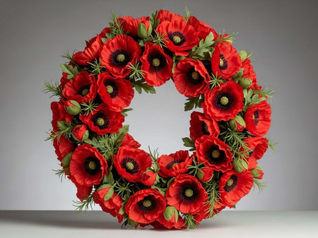 Elegant memorial wreath crafted with vibrant red poppy flowers and lush green leaves. Symbolizing remembrance, honor, and beauty, a poignant floral tribute.