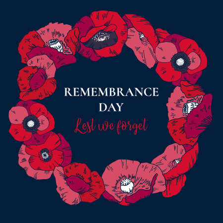Round frame. Remembrance day design template with red poppy flowers and title. Hand drawn vector sketch illustration on dark background