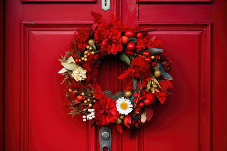 homemade boxing day wreath on the bright red door, created with generative ai