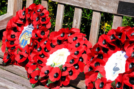Remembrance Sunday, Memorial day in London. Crown of red poppies in a city garden. United Kingdom