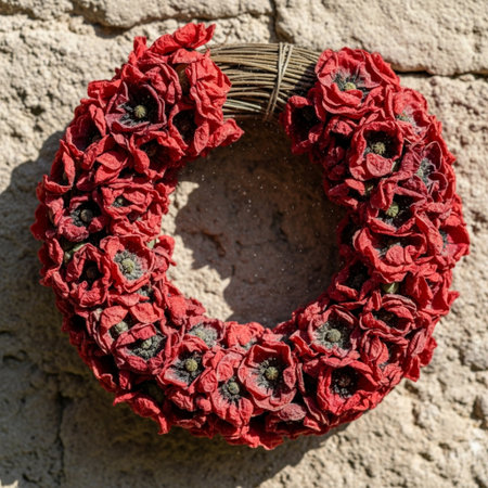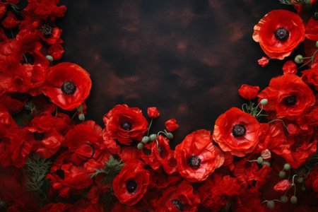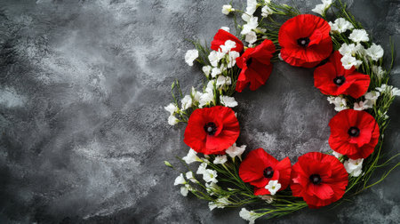 A beautiful wreath made of red poppy flowers and white accents is displayed on a dark textured surface, symbolizing remembrance and honoring those who served. Perfect for decoration