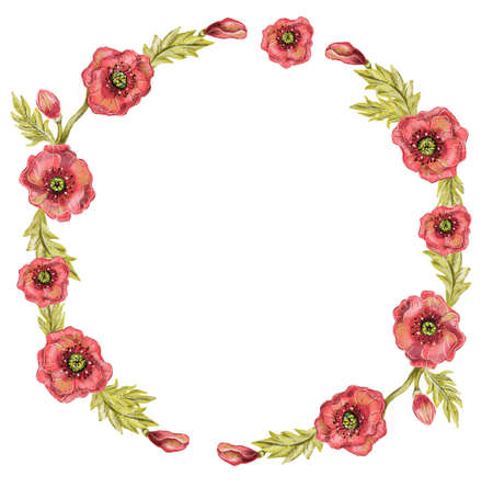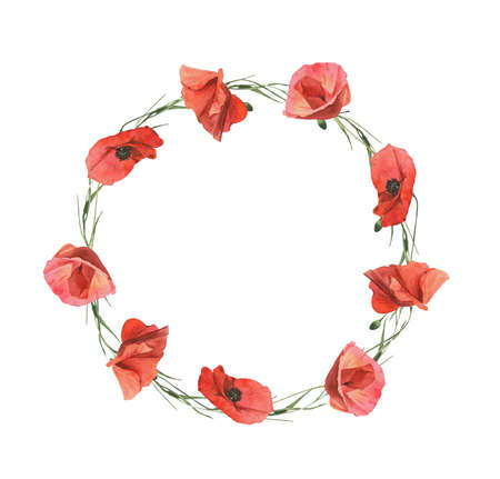 Red poppies wreath isolated on white background. Watercolor illustration.