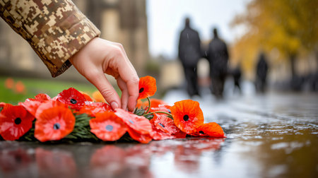 A soldier's hand placing a wreath decorated with red poppies on a memorial during a Veterans Day ceremony, illuminated by the soft glow of sunset.
