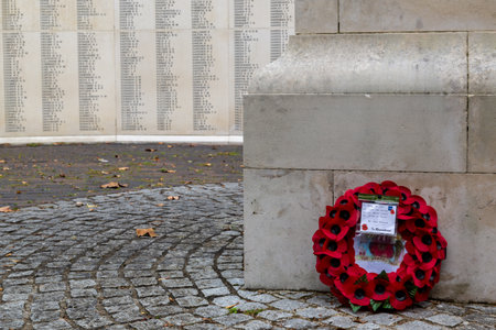 09/29/2020 Portsmouth, Hampshire, UK A single red poppy wreath laid against a war memorial with the names of those that died in world wars blurred in the background, Portsmouth