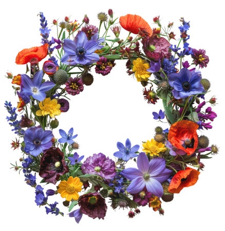 Spring flowers circle isolated on white background, Wildflowers wreath with empty space