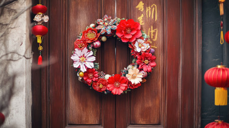 A creative DIY Chinese New Year wreath made from paper flowers and ornaments, hanging on a wooden door with festive decorations around.