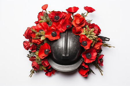 A world war military helmet with red poppies. Remembrance and armistice day symbol