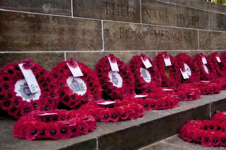 Red poppy wreaths laid at the bottom of a war memorial for Remembrance day