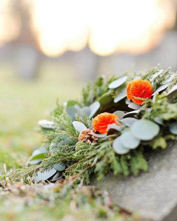 A closeup of a wreath with red white and green foliage placed on a headstone in a military cemetery during a soft morning light ,on National Wreaths Across America Day