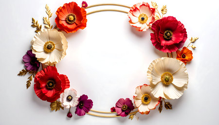 Wreath of red poppies on a white background with space for text