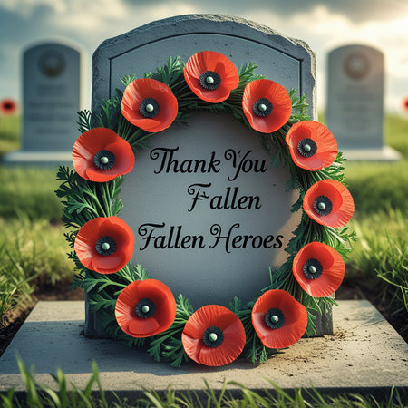A wreath of red poppies encircles the inscription Thank You Fallen Heroes on a gravestone in a cemetery.