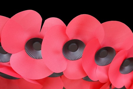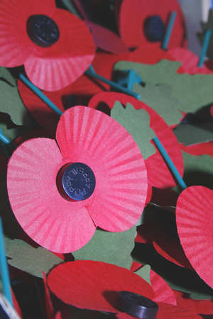 Remembrance Day poppy flower pins close up