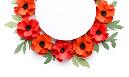 Blank paper sheet with poppy flowers and leaves on white background