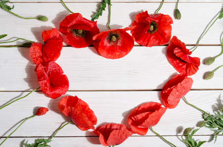 Beautiful red poppies in shape of heart on wooden background