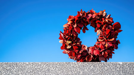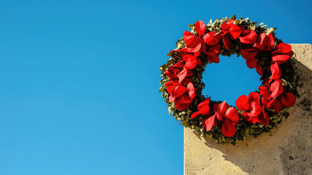 A stunning red floral wreath set against a vibrant blue sky, creating a warm and joyful atmosphere perfect for celebrating special occasions and events.