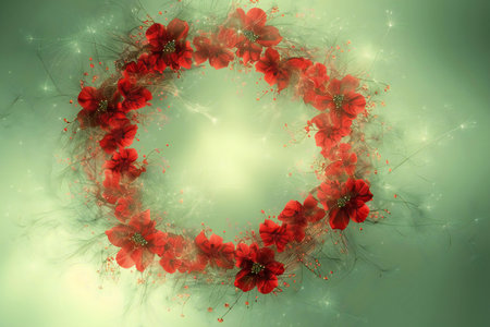 A wreath of red flowers is arranged in a circle on a blue background