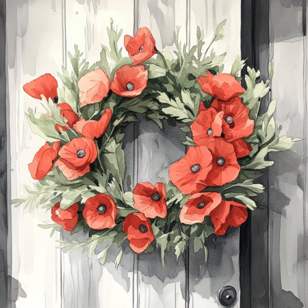 A lovely watercolor illustration depicts a Memorial Day wreath crafted from red poppies and American flags, elegantly displayed on a weathered wooden door, symbolizing remembrance.