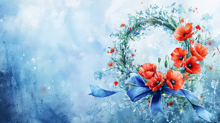 Watercolor Wreath of Red Flowers and Blue Ribbon for American Memorial Day. Concept of Patriotic Decoration, Remembrance, Floral Art, National Honor. Copy space.