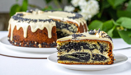 Poppy seed cake with poppy seeds on a white tablecloth.