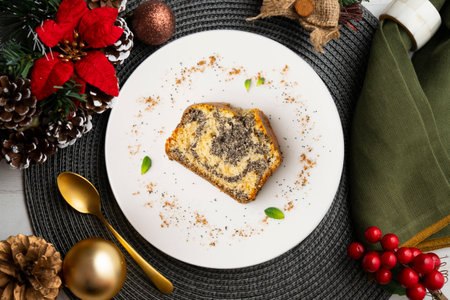 Delicious lemon and poppy seed cake. Top view table with christmas decorations.