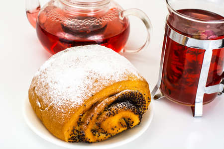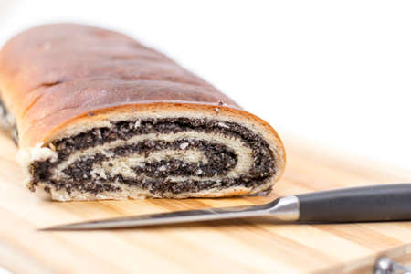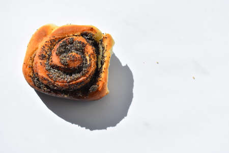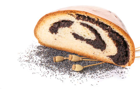 sweet pastries, roll with poppy seeds inside on a white background