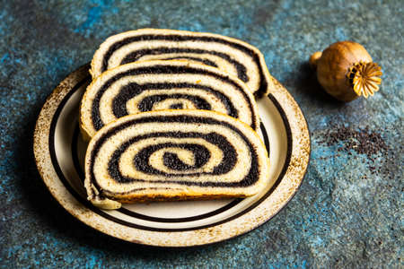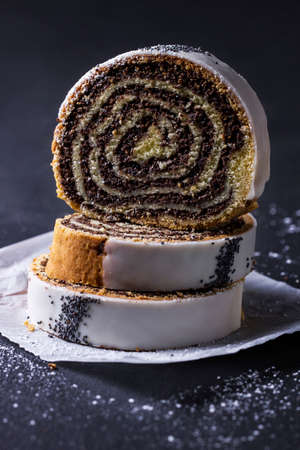 Poppy seed strudel dessert on dark background