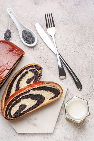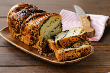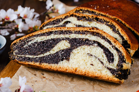 sweet pastries, roll with poppy seeds inside on a wooden table.