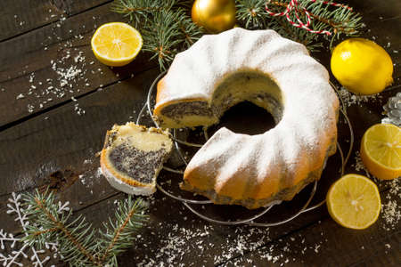 Christmas frame. Traditional homemade lemon cake with poppy filling. Dessert Christmas decoration on spruce vintage wooden background.